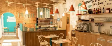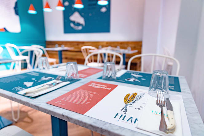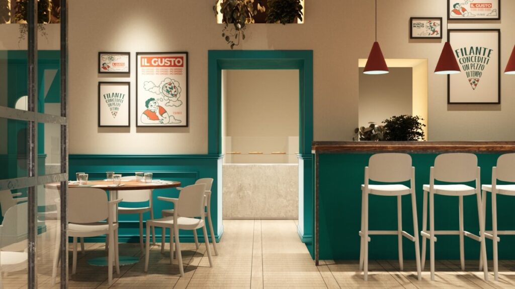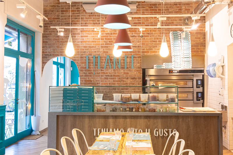 Le sedi di Filante a Milano hanno tutte un design semplice e informale, coerente con l’idea di pizza al trancio come street food urbano.