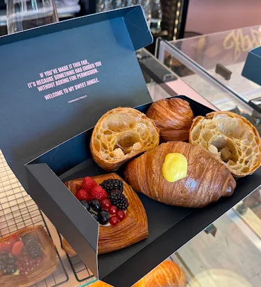 L’offerta di Sfoglia Pastry Bar ruota attorno alle diverse interpretazioni della millefoglie con farciture che cambiano durante la giornata. Tra le proposte si trovano millefoglie con crema pasticcera classica, crema al pistacchio o chantilly e frutti rossi. Accanto alle sfoglie non mancano viennoiserie contemporanee, croissant, pain au chocolat e altre preparazioni di pasticceria da colazione.