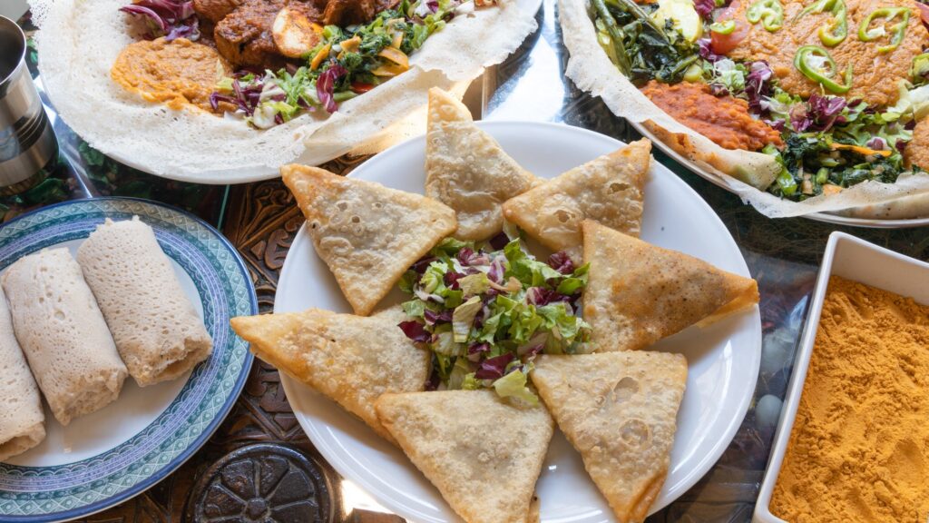 Tra gli antipasti si trovano invece le sambusa, fagottini fritti ripieni di carne o verdure, molto popolari nella cucina del Corno d’Africa.