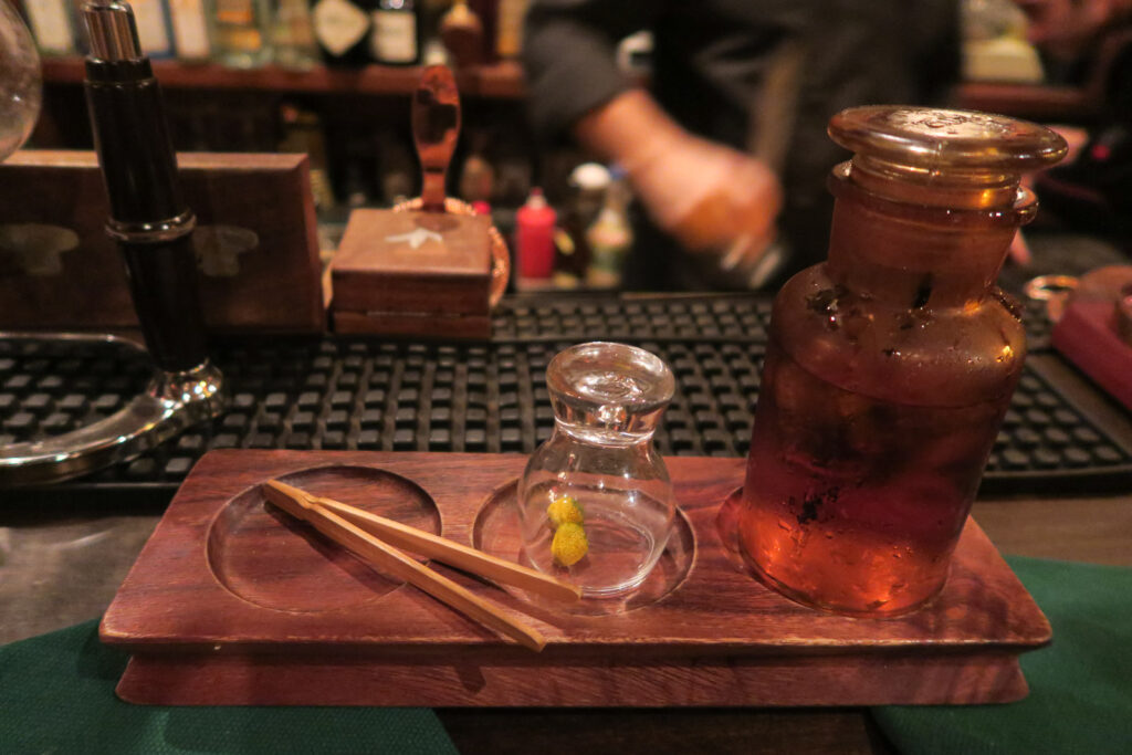 Il primo impatto con il Nottingham Forest è sorprendente. Dall’esterno sembra quasi anonimo. All’interno, invece, si apre un mondo fatto di oggetti, strumenti e suggestioni visive che ricordano un laboratorio più che un classico cocktail bar. Lo spazio è raccolto e intimo, e ogni dettaglio contribuisce a costruire un’esperienza diversa dal solito.