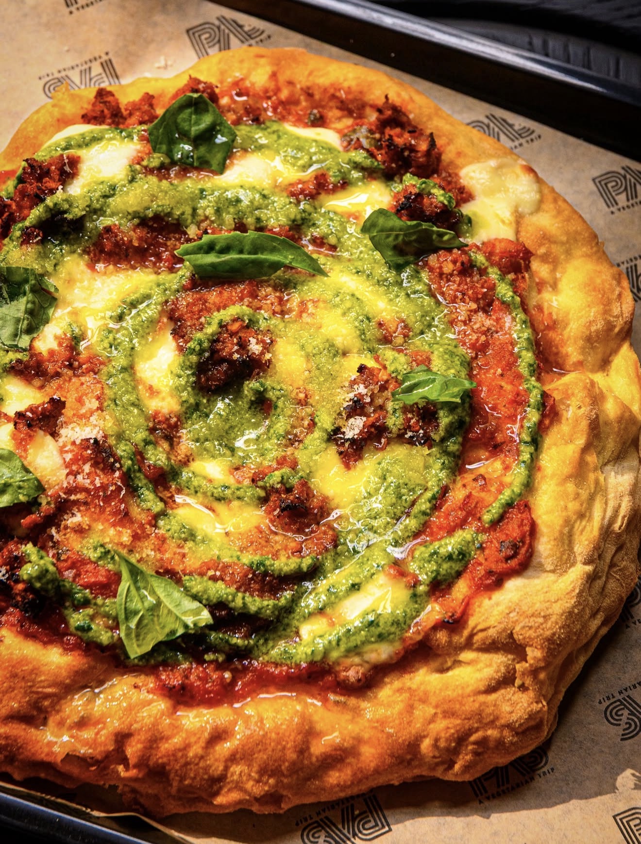 Dirty Pizza fritta con salsa marinara, mozzarella e salsiccia vegetale.