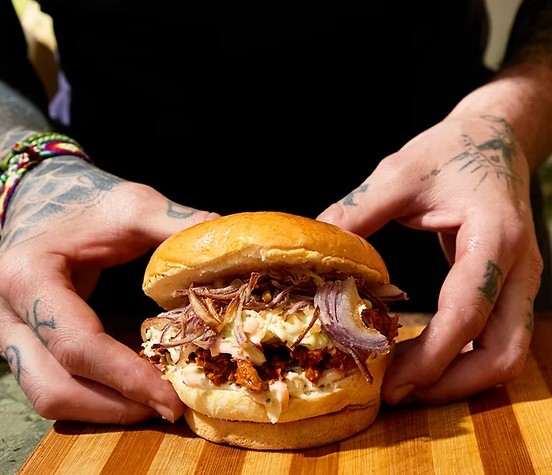 Pulled pork vegetale con bun morbido, salsa bbq e cavolo.